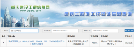 在“工程名稱”處查詢:重慶江津萬達(1#地塊)20-22、28-32A、32B、37-39#樓及對應地下車庫剩余部分