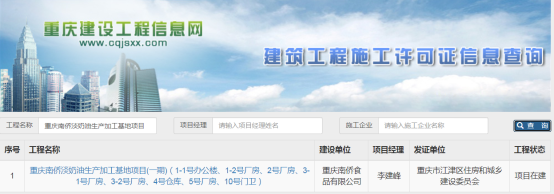 在“工程名稱”處查詢:重慶南僑淡奶油生產加工基地項目(一期)(1-1號辦公樓、1-2號廠房、2號廠房、3-1號廠房、3-2號廠房、4號倉庫、5號廠房、10號門衛)
