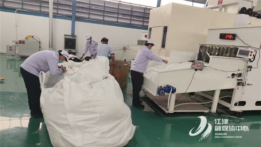 原料開松、梳理成網、針刺加固、定型……近日,在重慶璨月新材料有限公司(以下簡稱:璨月公司)泰國復合型材料工廠,自動化設備火力全開,一條剛剛投產的玻璃纖維針刺氈生產線正如火如荼忙生產。