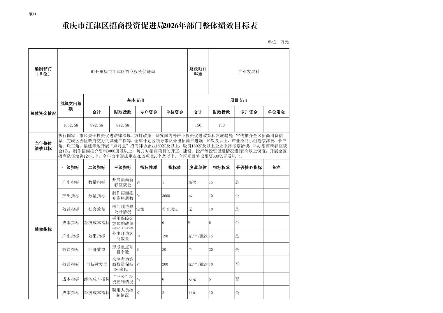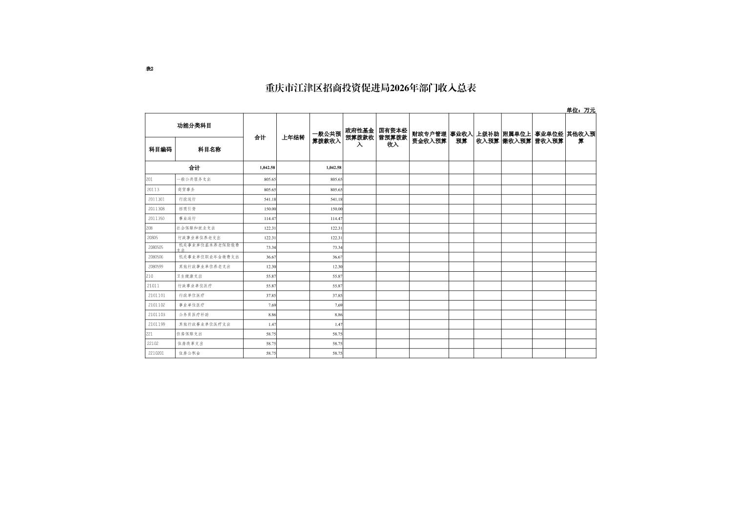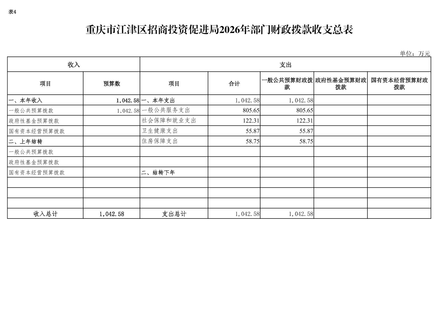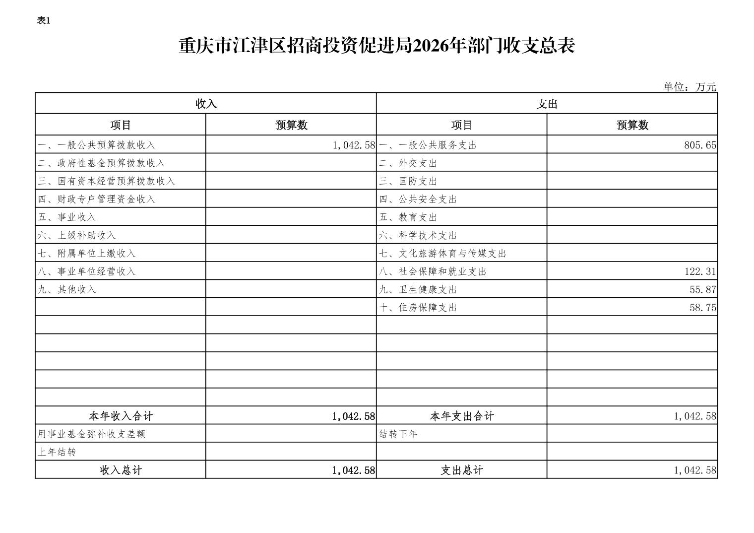 2026年年初預算收入總計1042.58萬元,支出總計1042.58萬元。