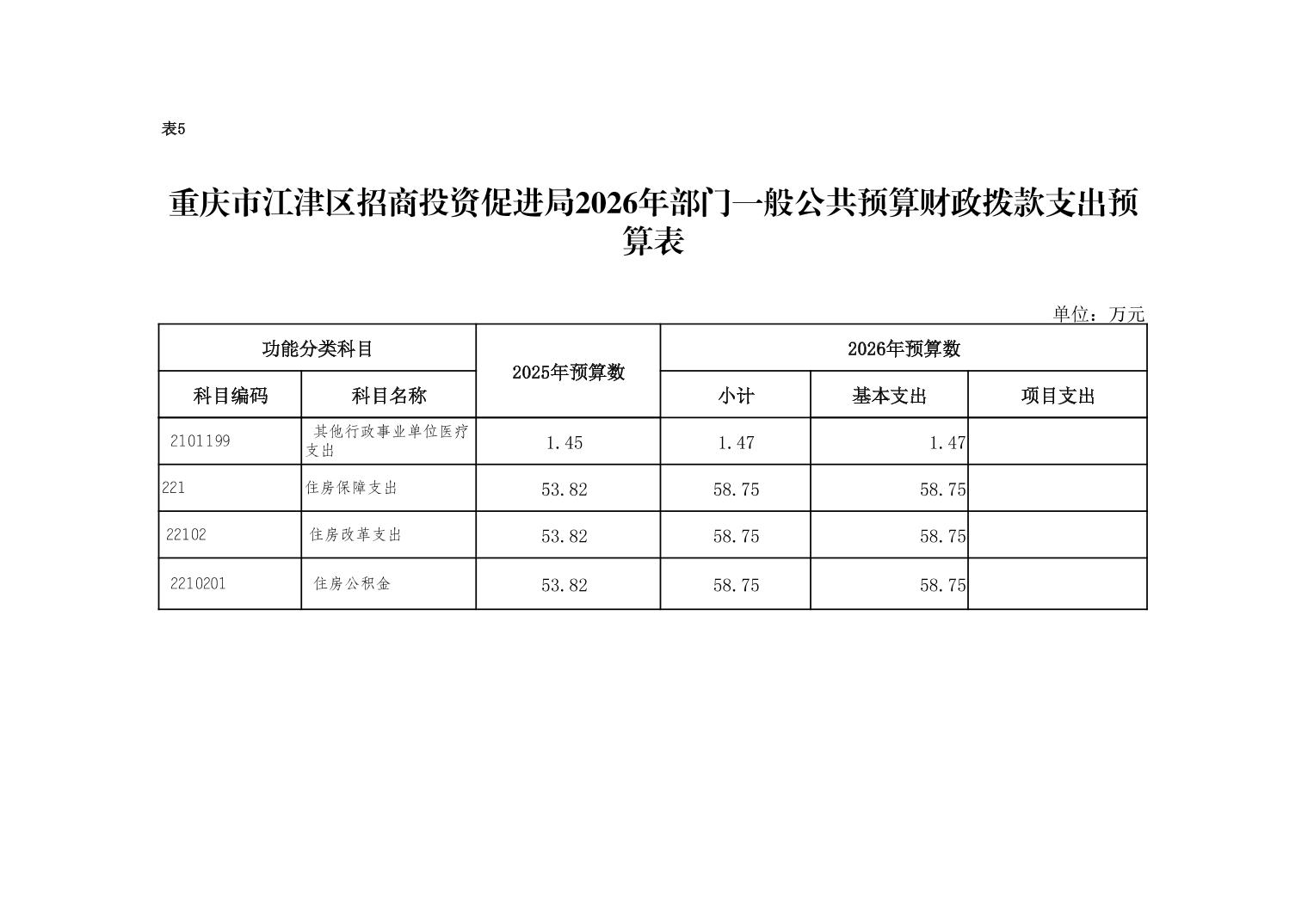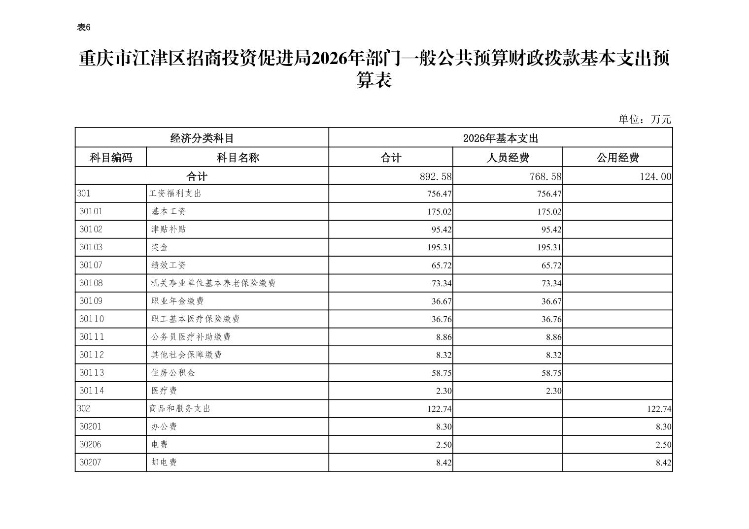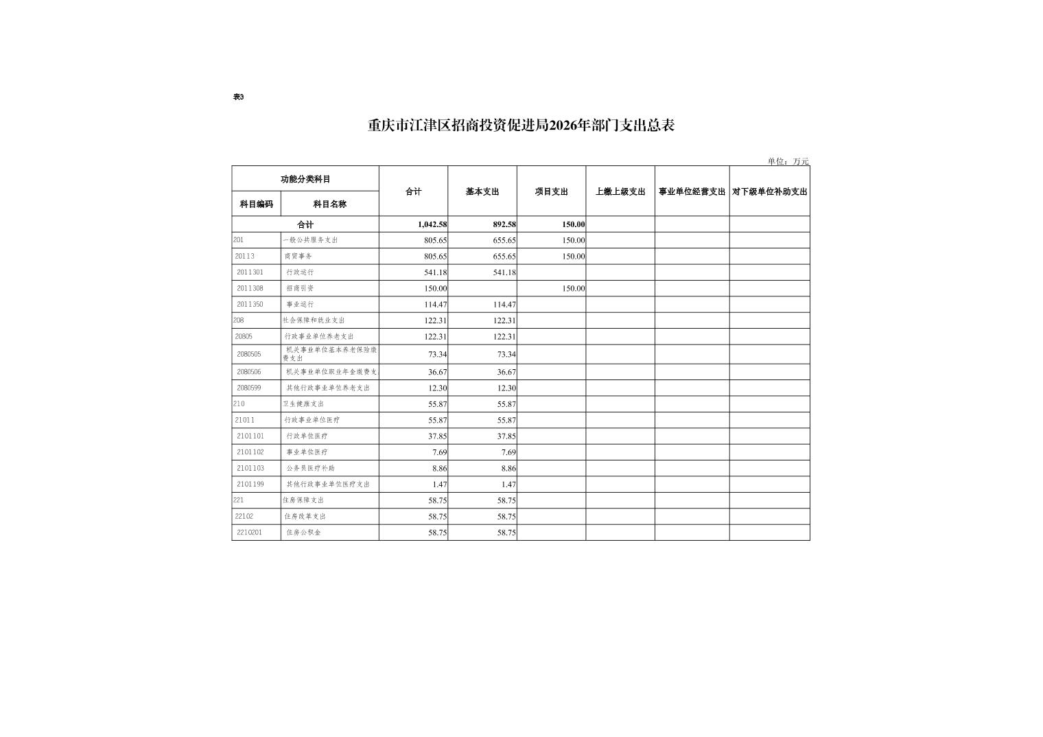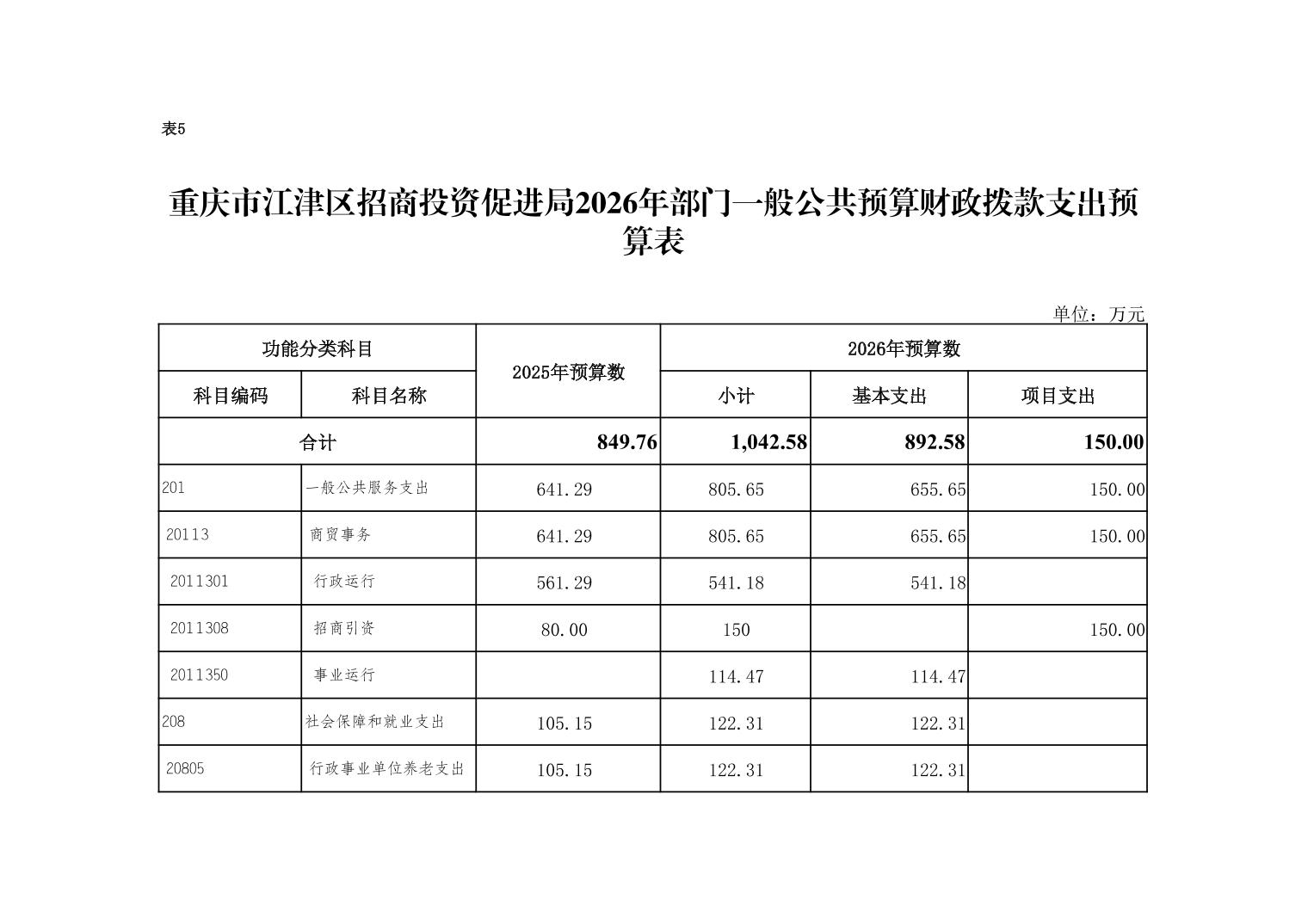 2026年一般公共預算財政撥款收入1042.58萬元,一般公共預算財政撥款支出1042.58萬元,比2025年增加192.82萬元。其中:基本支出892.58萬元,主要用于保障在職人員工資福利及社會保險繳費,退休人員補助等,保障部門正常運轉的各項商品服務支出,比2026年增加122.82萬元,主要原因是新增正科級二級預算單位1個,人員經費和公用經費隨之增加;項目支出150萬元,主要用于執行國家、市區關于投資促進法律法規、方針政策;研究國內外產業投資促進政策和發展趨勢;宣傳推介全區招商引資信息;完成區委區政府交辦的其他工作等。比2025年增加70萬元,主要原因是2025年項目支出主要是市級獎勵,區級未列入預算。