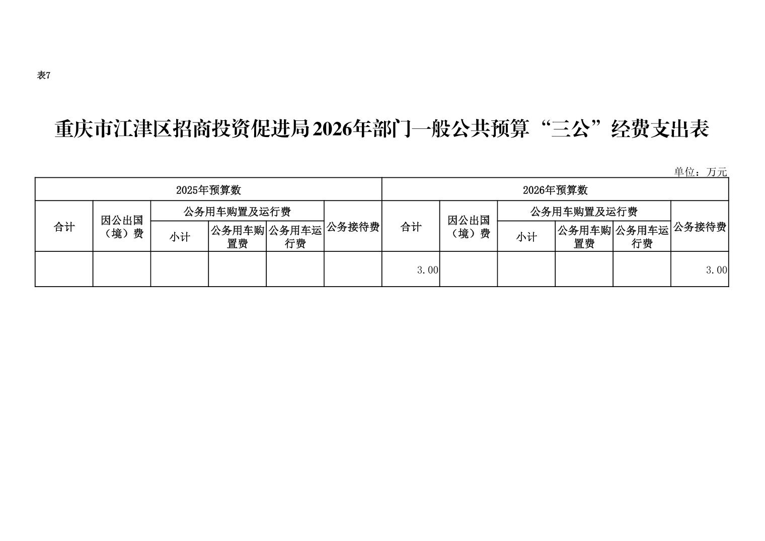 2026年一般公共預算“三公”經費年初預算3萬元,比2025年增加3萬元,主要原因是2025年當年項目支出年初預算不足,年初未預算該筆費用。