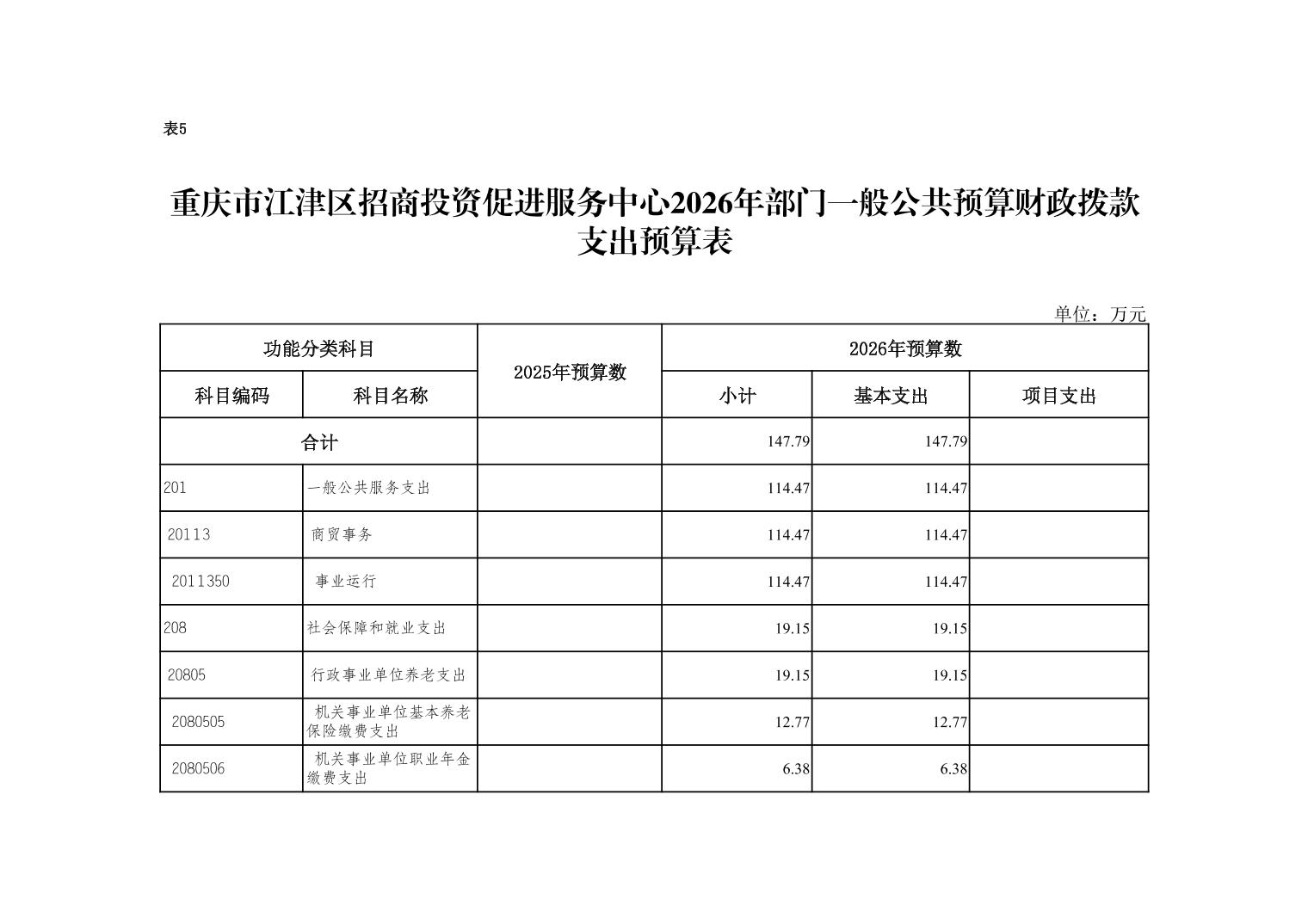 2026年一般公共預算財政撥款收入147.79萬元,一般公共預算財政撥款支出147.79元,比2025年增加147.79萬元。其中:基本支出147.79萬元,主要用于保障在職人員工資福利及社會保險繳費,退休人員補助等,保障部門正常運轉的各項商品服務支出,比2025年增加147.79萬元,主要原因是該單位為2025年新增正科級事業單位,年初無預算。
