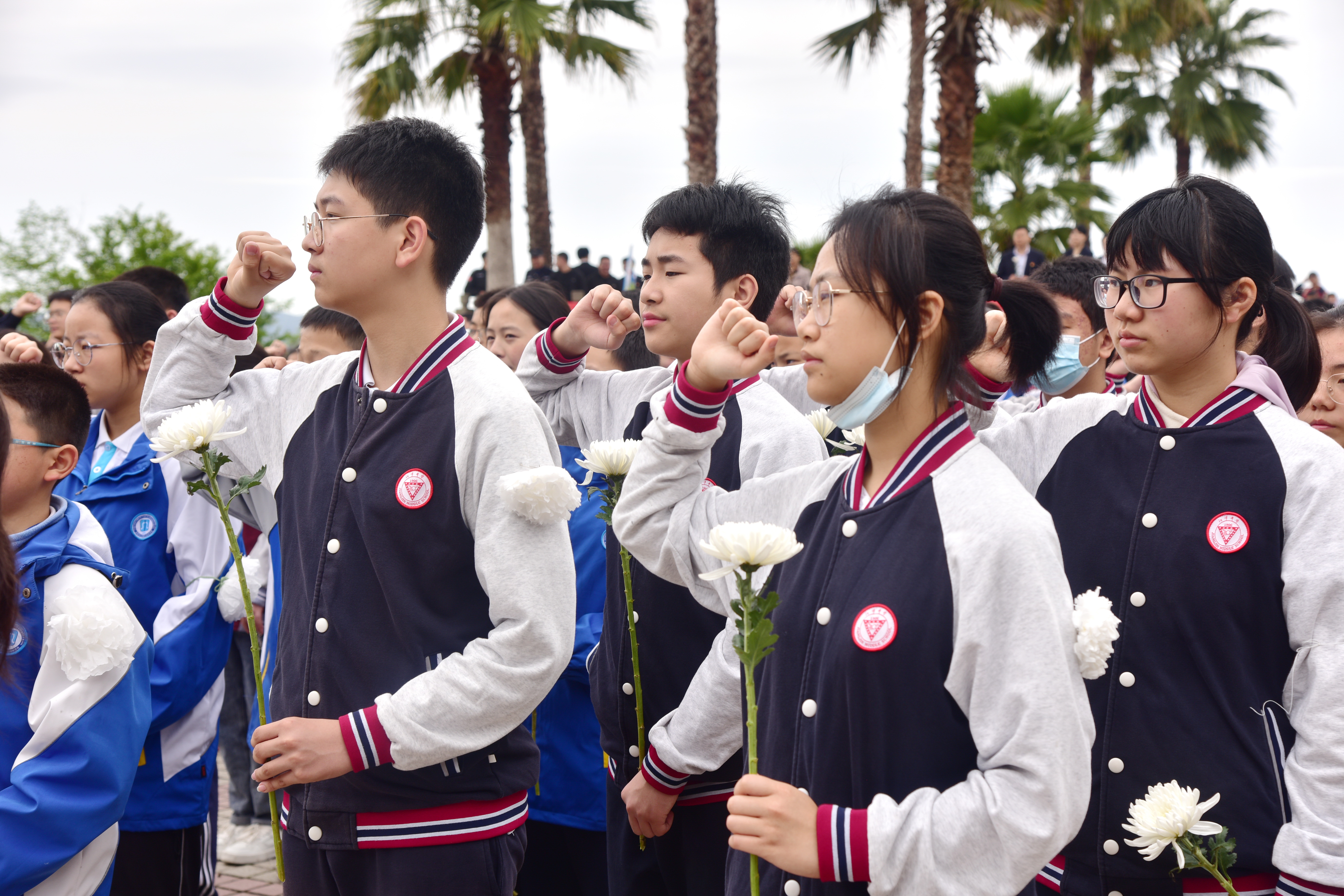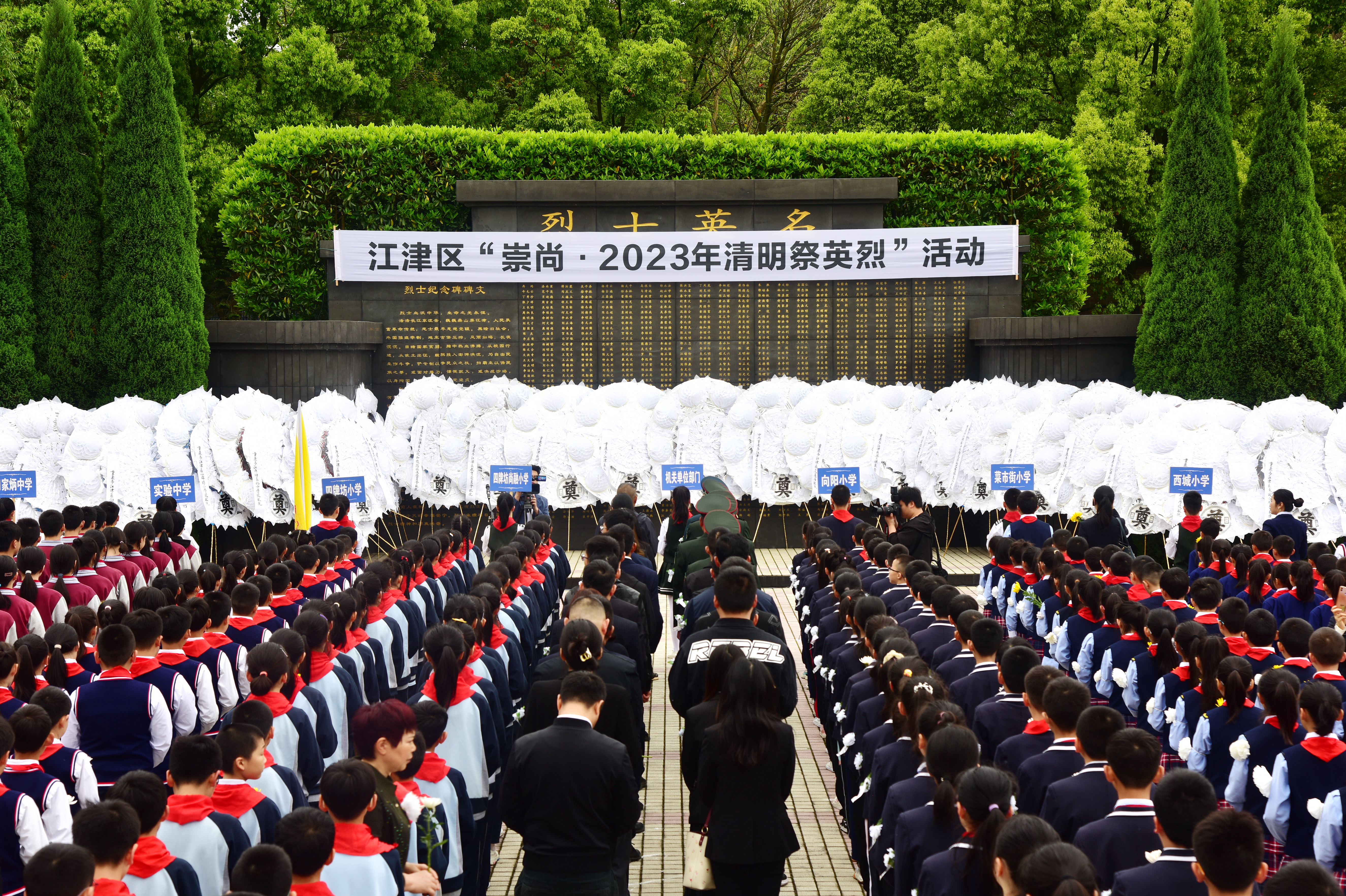 ????烈士陵園松柏環繞,鮮花簇擁著烈士陵園英名墻,哀樂回蕩。大家整齊地站在烈士陵園英名墻前,鞠躬默哀、聆聽革命先烈英勇事跡,進行莊嚴宣誓,江津區學生代表還發表了一番講演,號召同學們要發憤圖強,學習先輩的愛國主義精神。儀式結束后,全體人員繞行烈士墓一周,敬獻鮮花。