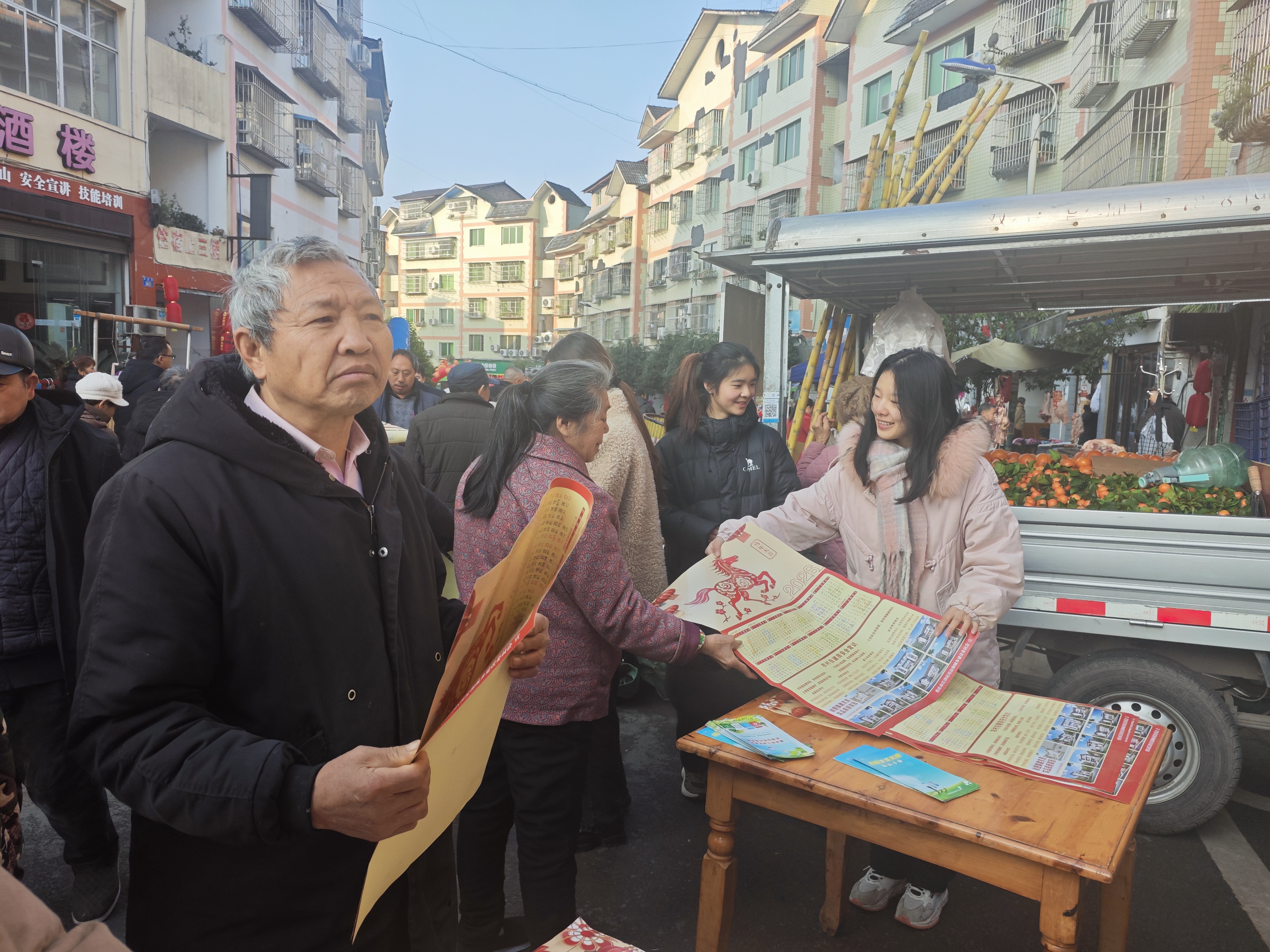 活動現場,工作人員在趕集日設置發放點位,熱情地向過往群眾遞上日歷,送上新年祝福。不少群眾駐足領取、翻看點贊,大家紛紛表示,日歷實用美觀、內容貼心,既方便查看節氣與農事安排,也能感受到政府的暖心關懷。同時,針對行動不便的老人、獨居戶及偏遠村組群眾,村(社區)干部逐一敲門送福,親手將日歷送到群眾家中,與群眾拉家常、問冷暖,詳細了解生產生活情況,叮囑冬季用火用電安全、防寒保暖與出行安全,把服務做到群眾家門口、心坎上。