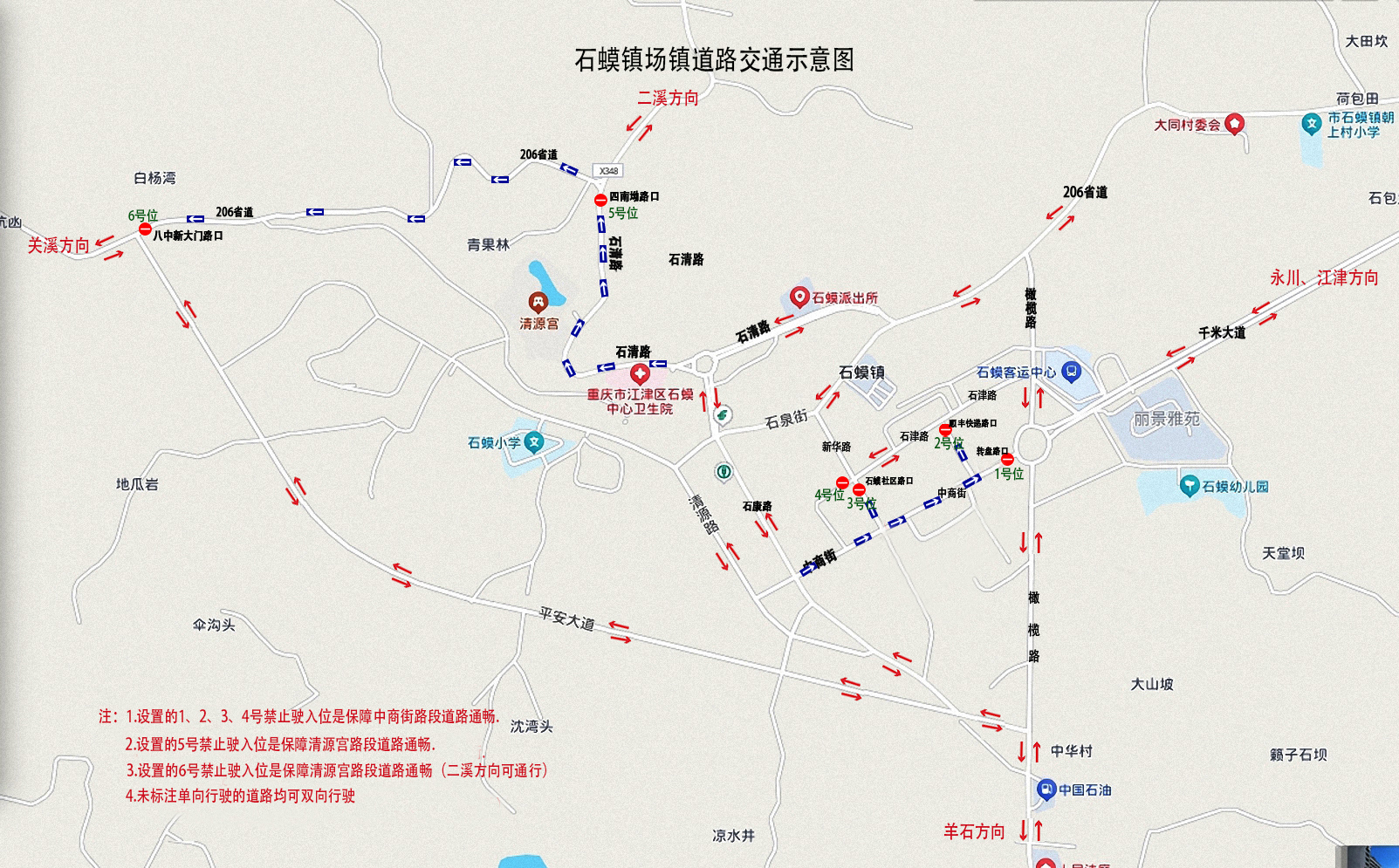 注:四南坳往石蟆街道方向禁止駛入。