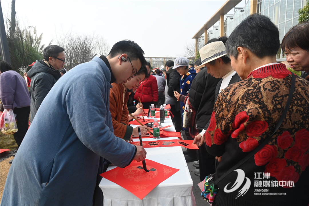 本次村晚精心設置了五大特色體驗區域,生動展現鄉村蓬勃生機與濃濃年味。特色農產品展銷區,富硒菜籽油、大雅耙耙柑、高山野生蜂蜜等江津特產琳瑯滿目,游客們爭相選購;非遺體驗區,米花糖、剪紙、竹編、糖畫等傳統技藝吸引了不少年輕人駐足體驗;書法楹聯互動區墨香四溢,書法家們揮毫潑墨,將新春祝福化作一副副紅火對聯贈予鄉親;農耕趣味體驗區更是歡聲不斷,游客通過趣味游戲感受農耕文化的樂趣。