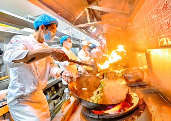 ??2026年2月18日,天津市濱海新區一家飯店的廚師正在烹制團聚宴菜品。
