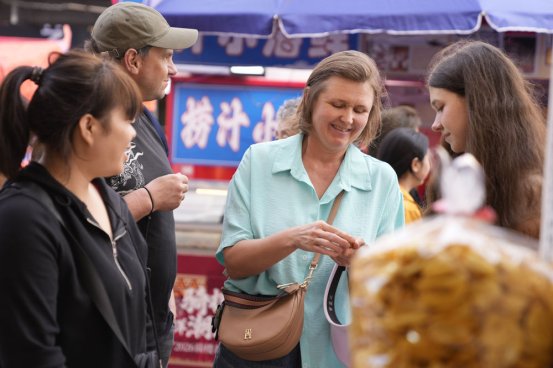 ??2026年2月4日,來自俄羅斯的游客在海南海口騎樓老街年貨集市上選購干果。