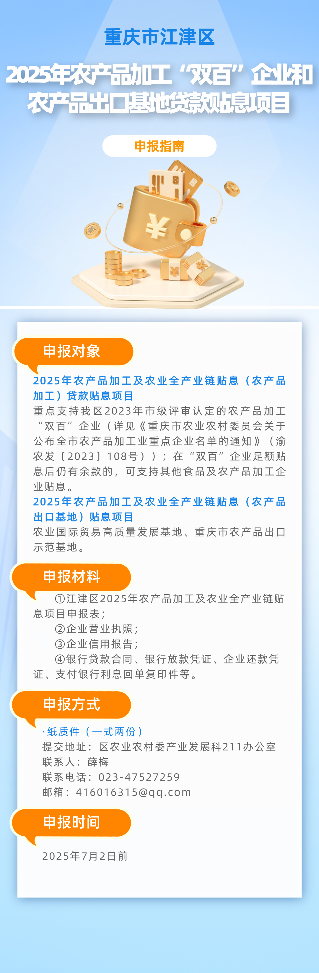 申報指南:重慶市江津區(qū)2025農(nóng)產(chǎn)品加工“雙百”企業(yè)和農(nóng)產(chǎn)品出口基地貸款貼息項目